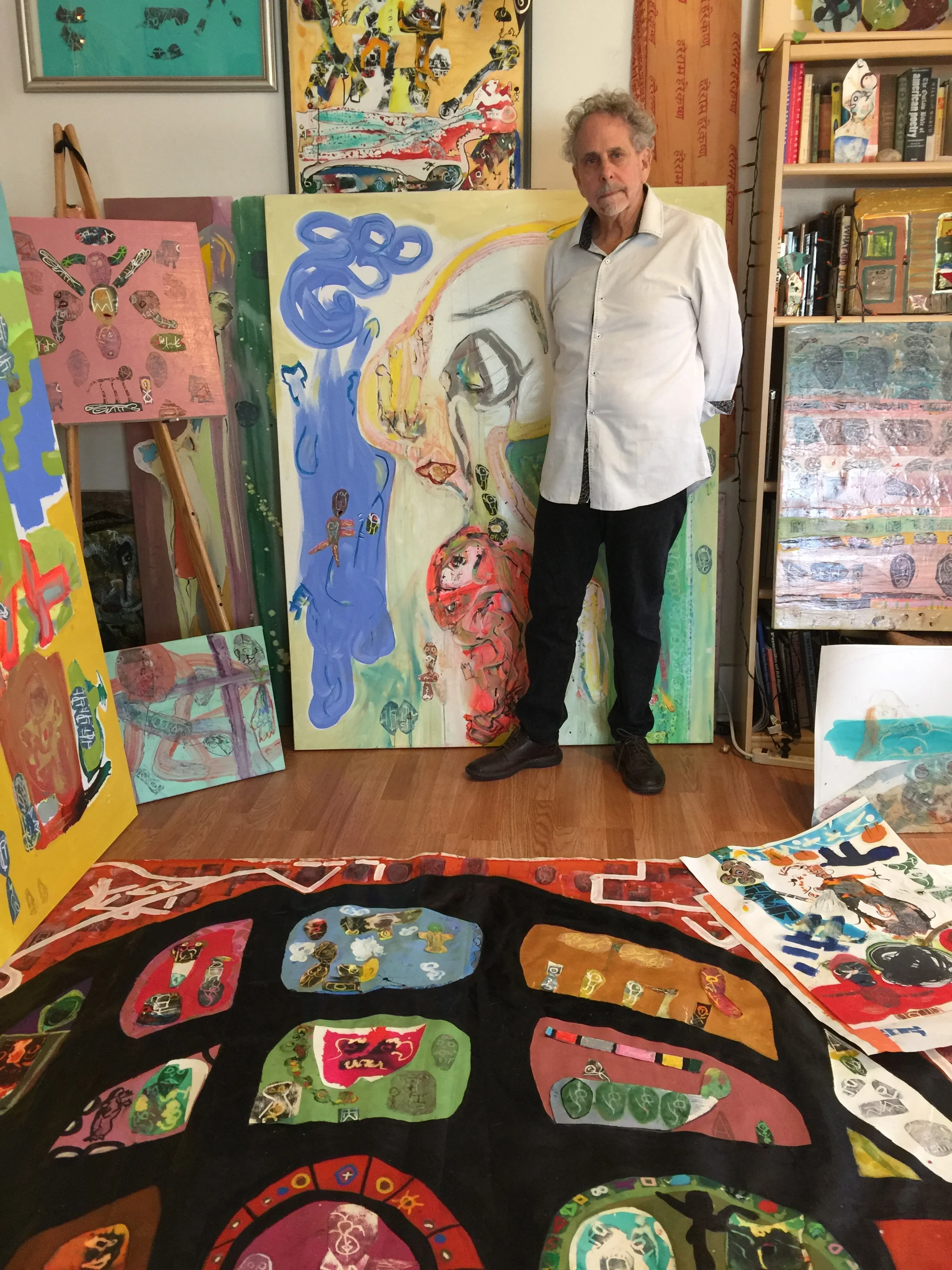 I am a narrative artist who creates psychological landscapes populated by neo-archaic figures and shapes. I like to renew the power of primitive imagesby triggering shared memories. If they resonate they give us hope for the future. Many of these images migrate from my paintings into 3D installations, personalized settings and puppet-like shapes on canvas, wood, aluminum and found objects. My palette is usually vibrant and lyrical using oil, ink, pastels, and unusual media like carved stamps. The tales I tell spring from our metaphysical past, eternal conflicts and primeval mythology. Creation stories, dance and charmed rituals get explored. Repetition and rearrangement of these images introduce them into our reality. This process is similar to play where mimesis becomes the practical vehicle to explore our relationships. My long history directing theatre drives my desire to create gestural entertainment using the frame as a stage. I draw inspirations from many sources: the scenic metaphors of Robert Wilson, Svoboda, and Appia inspire my use of light and movement. The charming mysticism of Klee, Giotto and Dubuffet feed my imagination. I dedicate my worktocreating a space where dynamic figures get a chance to play in color and action.